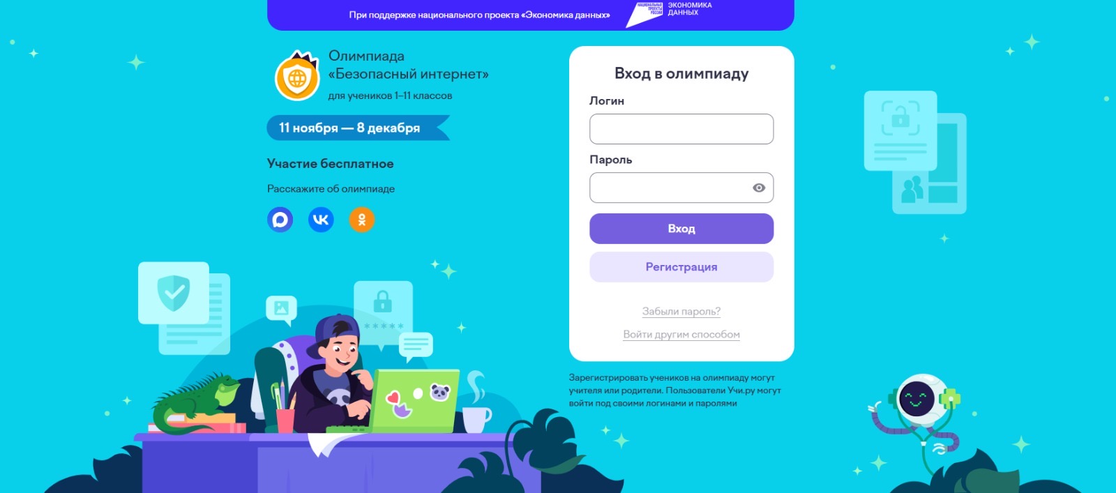 13.11.2025С 11 ноября по 8 декабря пройдет Всероссийская онлайн-олимпиада «Безопасный интернет», направленная на развитие у школьников навыков безопасного поведения в сети и ответственного использования современных технологий. К участию приглашаются ученики 1–11 классов со всей России. Олимпиада организована АНО «Национальные приоритеты» при поддержке Минцифры России, национального проекта «Экономика данных» и образовательной платформой Учи.ру.
