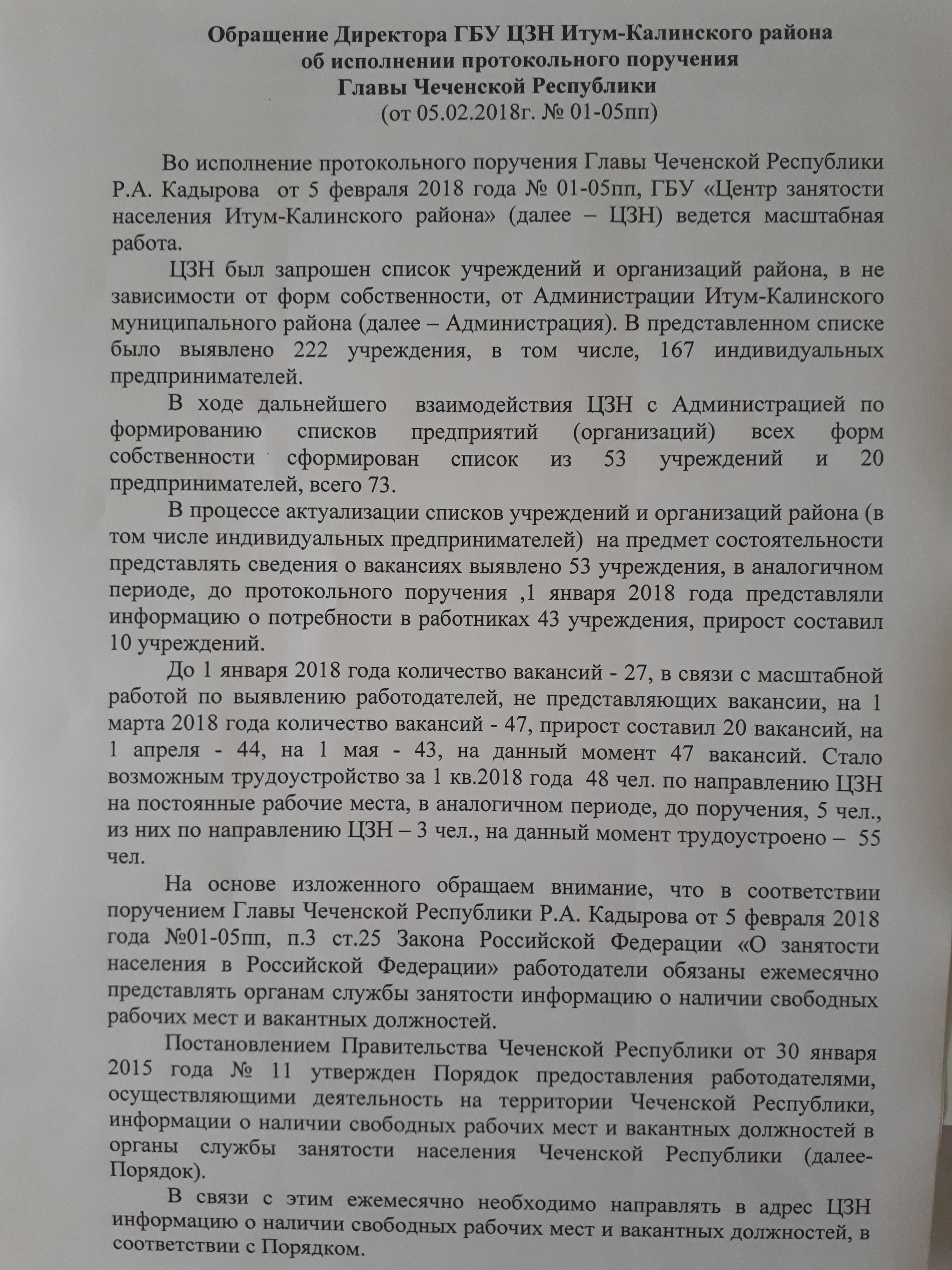 Обращение директора ГБУ "ЦЗН Итум-Калинского района" об исполнении протокольного поручения главы Чеченской Республики