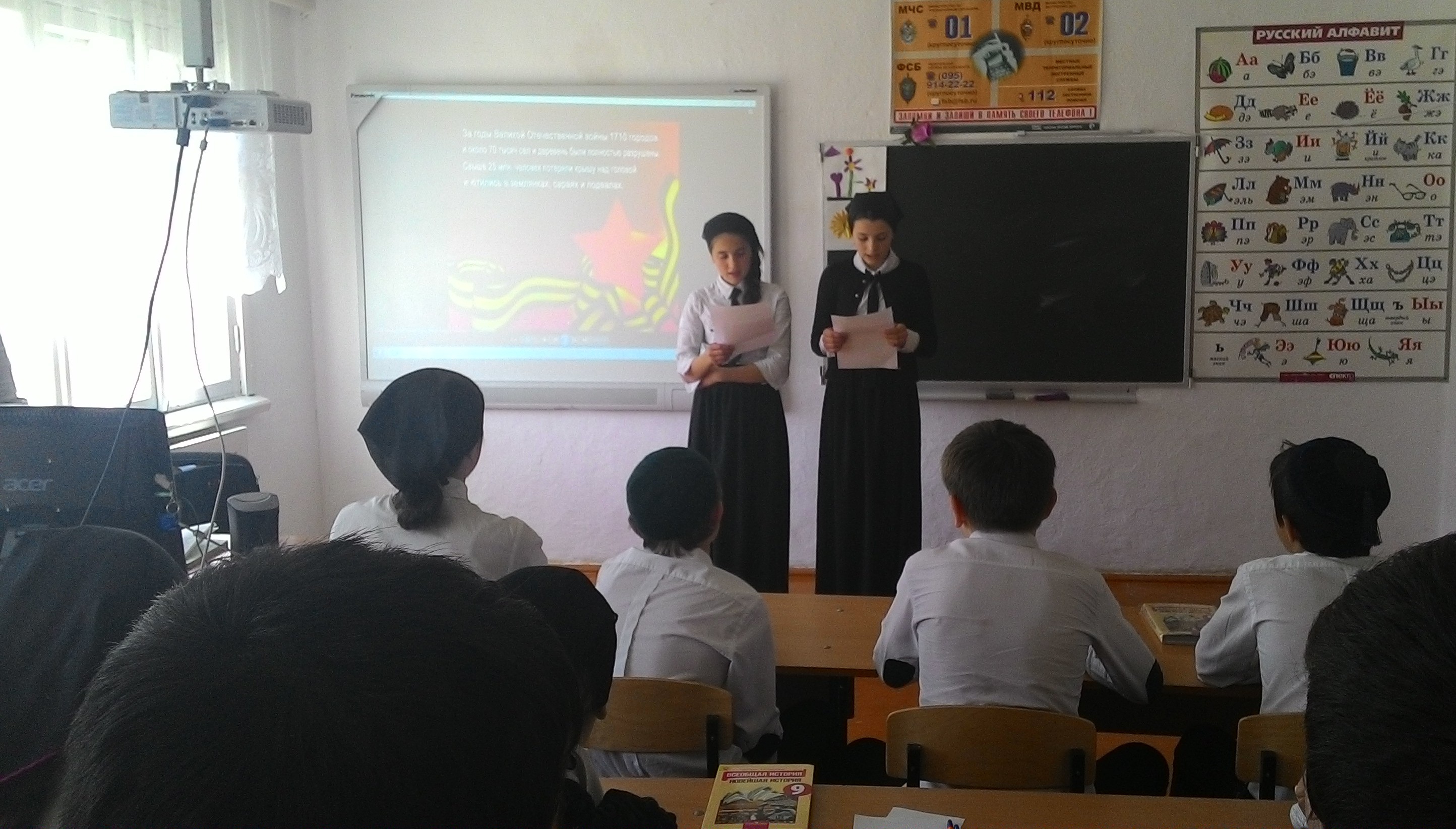 Вела урок учительница истории Расухаджиева Айшат Адамовна. Урок был очень насыщенным и интересным. Учительница Расухаджиева Айшат Адамовна использовала все виды современной технологии. На уроке были использованы исторические документальные материалы, фрагменты документального фильма, выступления обучающихся основанные на исторических фактах, событиях, работа с историческими терминами, понятиями. На интерактивной доске был показан насыщенный материал по теме урока. Учащиеся материал усвоили и отвечали на вопросы учителя.