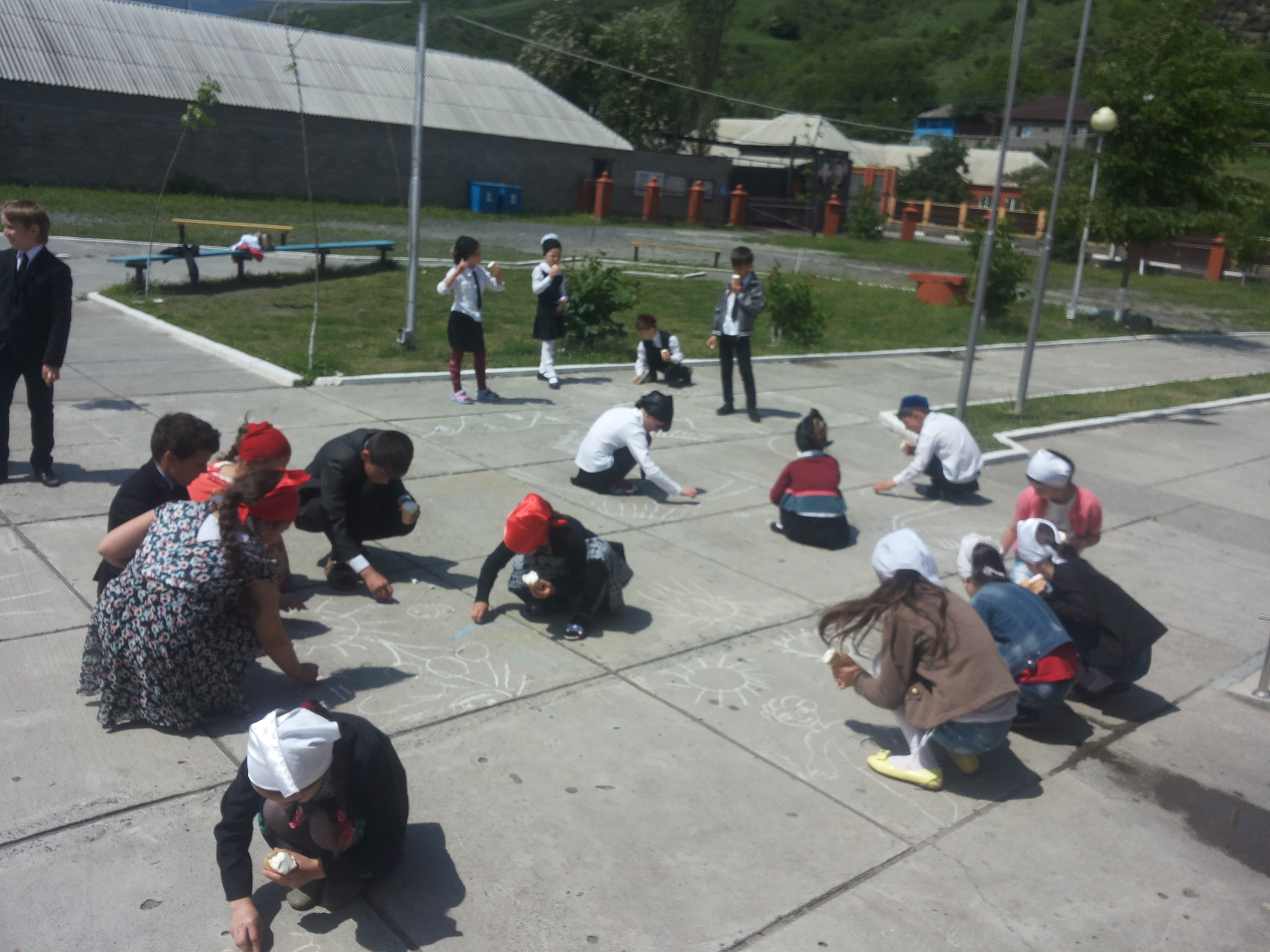 Дети цветными мелками рисовали на асфальте рисунки «Я рисую настроение». Им также раздали сладости.