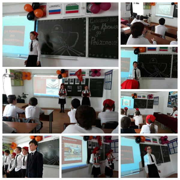 С 6 по 8 мая в школе проведены классные часы, приуроченные ко Дню Победы: " От Кремля до Рейхстага", " Вечный огонь обращается к живым", " Наш край в годы Великой Отечественной Войны".